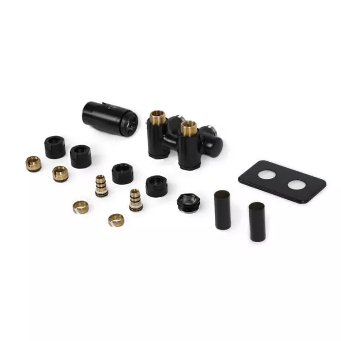 W zestawie: Zawór zintegrowany termostatyczny, Głowica termostatyczna M30 × 1.5, Zestaw maskujacy, 2 × adapter PEX, ALU-PEX 16×2, 2 × adapter CU Ø 15